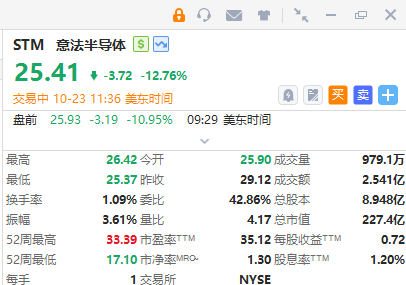 意法半导体大跌逾12%,报25.41美元。财报显示,意法半导体第三季度营收为31.9亿美元,分析师预测为31.2亿美元;营业利润为1.8亿美元,分析师预期为2.144亿美元。该公司预计四季度营收为32.8亿美元,低于分析师平均预期33.5亿美元。同时,公司宣布将年度净资本支出计划缩减至20亿美元以下,以“根据当前市场状况优化投资”,而此前预期为20亿—23亿美元。