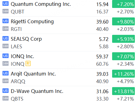 量子计算概念股夜盘续涨,D-Wave Quantum Inc.涨超7%,Arqit Quantum Inc.涨超4%, Rigetti Computing、Quantum Computing Inc.、IONQ Inc.涨超2%。