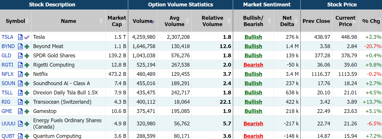 周四,期权市场总成交量5783.39万张合约,低于90日均量;特斯拉当日期权成交超427万张,看涨比升近六成;量子计算概念股集体大涨,RGTI、QUBT看涨期权占比大幅攀升>>