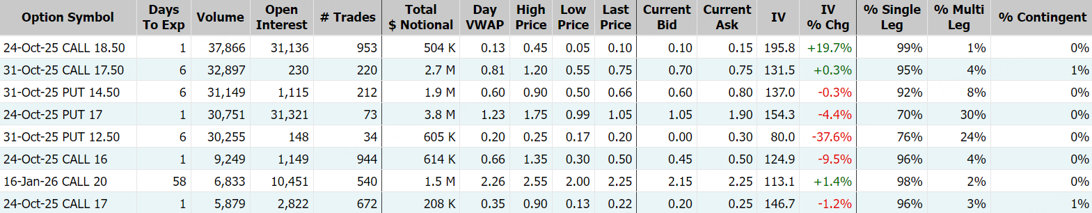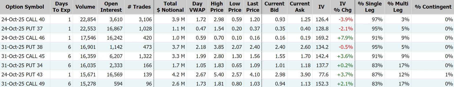 期权方面,Rigetti Computing当日期权成交52.52万张,较90日均量放大2倍,看涨期权占比升至48.3%,其中于10月24日到期的40美元行使价的看涨期权成交居前,成交近2.3万张; $RGTI 20251024 40.0 CALL$