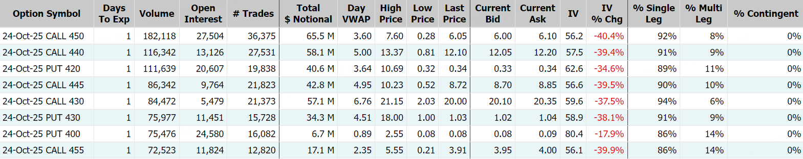 期权方面,特斯拉当日期权成交超427万张,环比前一交易日激增238%,看涨期权占比攀升至59.8%,其中于10月24日到期的450美元行使价的看涨期权成交居前,成交逾18万张。 $TSLA 20251024 450.0 CALL$