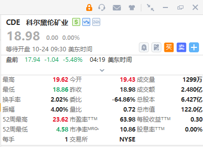 美股黄金概念股盘前下挫,科尔黛伦矿业跌超5%,金罗斯黄金、金田、哈莫尼黄金跌逾2%。