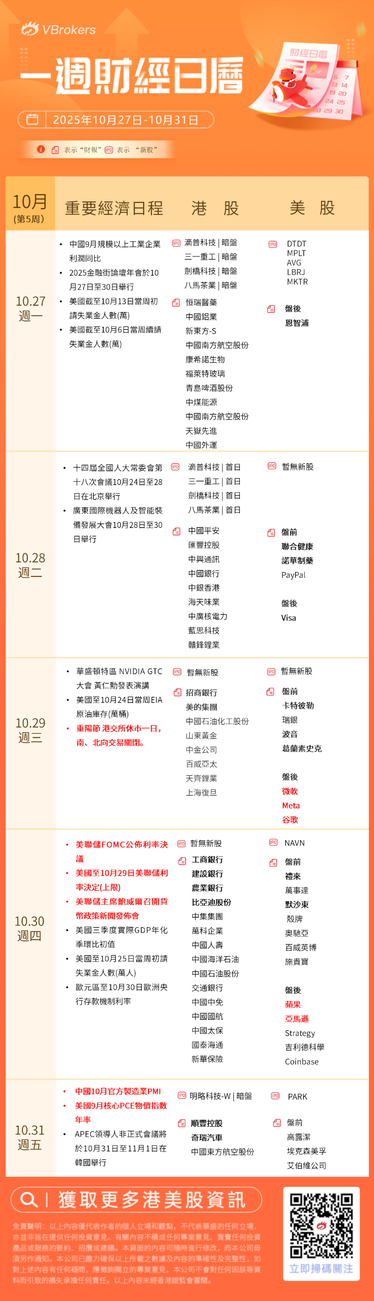 周三 (10.29): 1、重阳节 港交所休市一日,南、北向交易关闭。 周四 (10.30): 1、美联储FOMC公布利率决议 2、美联储主席鲍威尔召开货币政策新闻发布会 周五 (10.31): 1、APEC领导人非正式会议将于10月31日至11月1日在韩国举行 |