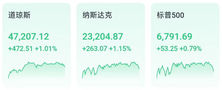 截至收盘,道指涨472.51点,涨幅为1.01%,报47207.12点;纳指涨263.07点,涨幅为1.15%,报23204.87点;标普500指数涨53.25点,涨幅为0.79%,报6791.69点。