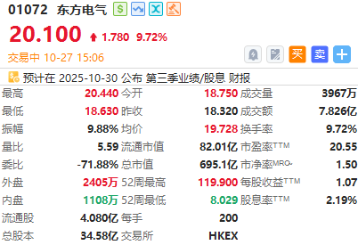 华盛资讯10月27日讯,港股电力概念股午后持续走高,哈尔滨电气涨超11%,东方电气涨近10%,上海电气涨近5%,大唐发电涨超2%。