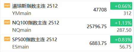 10月27日,美股三大股指期货上涨,截止发稿,道指期货涨0.66%,纳指期货涨1.13%,标普500指数期货涨0.83%。