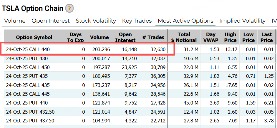 周五特斯拉期权合约成交量为397万份,较前一交易日下降8%。看涨期权占期权交易总量的57%,成交榜首位是一份行权价440美元的CALL。