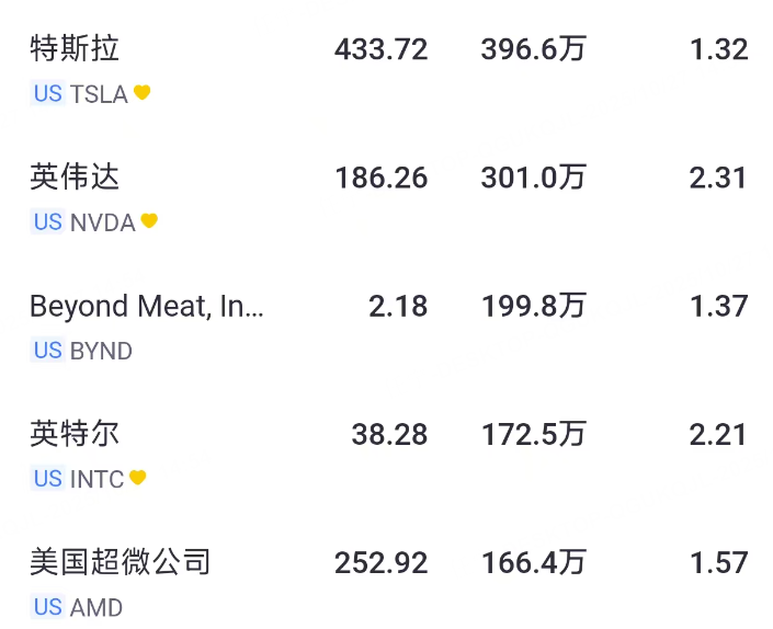 特斯拉 、 英伟达 、 Beyond Meat, Inc. 、 英特尔 、 美国超微公司 排在个股期权成交的前列。