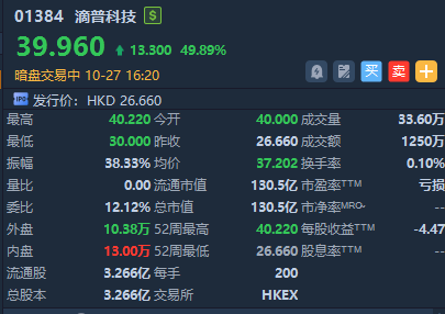 华盛资讯10月27日讯,港股滴普科技正在暗盘交易中,截至发稿涨近50%,报39.96港元/股,中签一手账面浮盈2660港元,最新总市值超130.5亿港元。该股预计将于10月28日正式挂牌上市,配售结果将于今日晚间披露。
