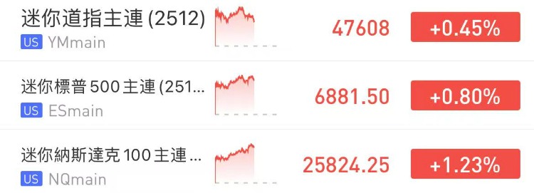 受中美贸易紧张局势缓和影响,美股三大指数期货盘前走强,纳指期货 $NQmain 涨1.23%,标普500期货 $ESmain 涨0.80%,道指期货 $YMmain 涨0.45%。