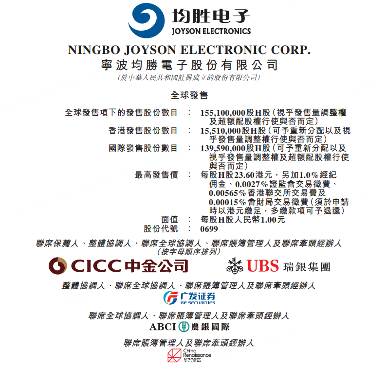 10月28日,均胜电子(00699)于10月28日-11月3日招股,拟全球发售1.551亿股H股,香港公开发售占10%,国际发售占90%,另有15%超额配股权。发售价将不超过23.60港元,每手500股,预期H股会在11月6日开始在联交所买卖。