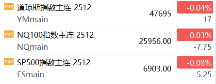 10月28日,美股三大股指期货下跌,截止发稿,道指期货跌0.04%,纳指期货跌0.03%,标普500指数期货跌0.08%。