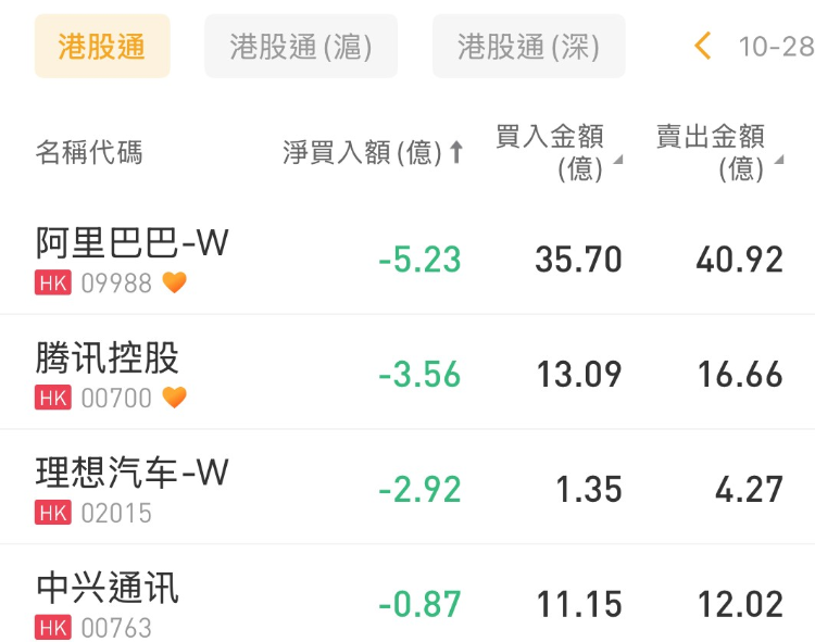 阿里巴巴-W、腾讯控股、理想汽车-W分别遭净卖出5.23亿港元、3.56亿港元、2.92亿港元。