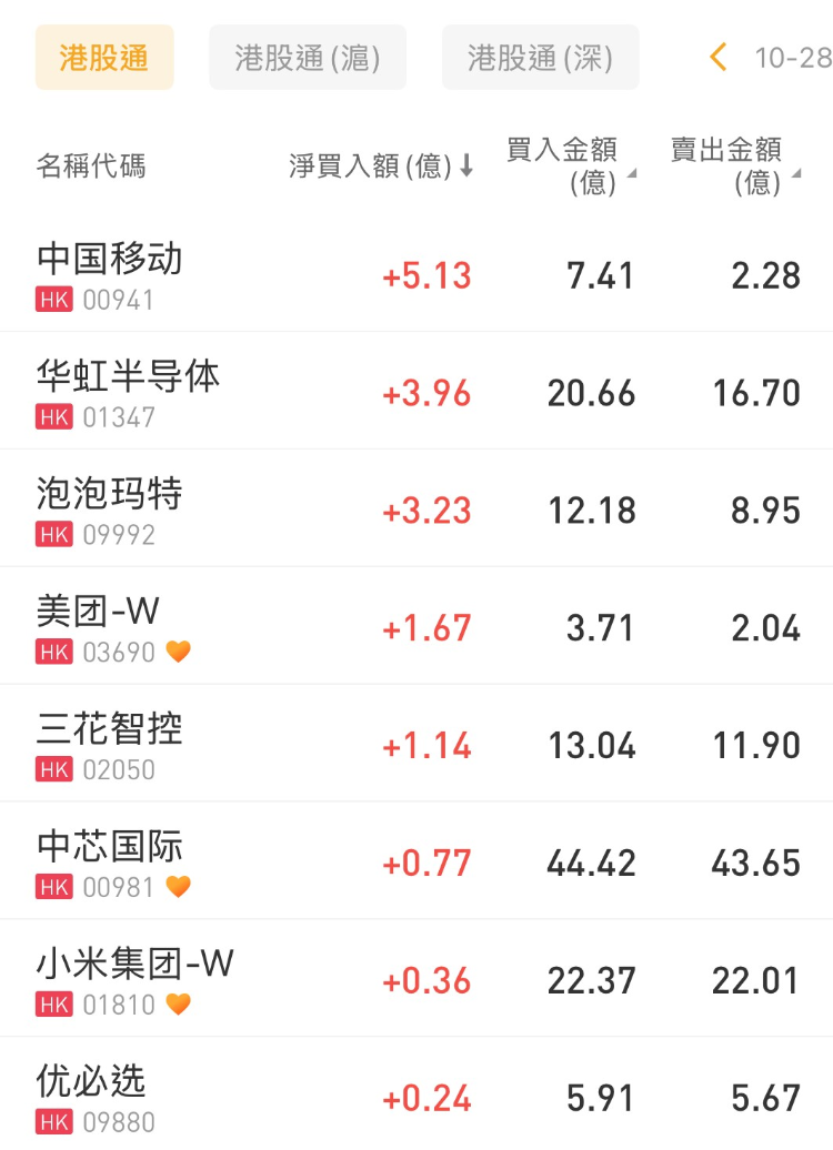 中国移动、华虹半导体、泡泡玛特分别获净买入5.13亿港元、3.96亿港元、3.23亿港元;