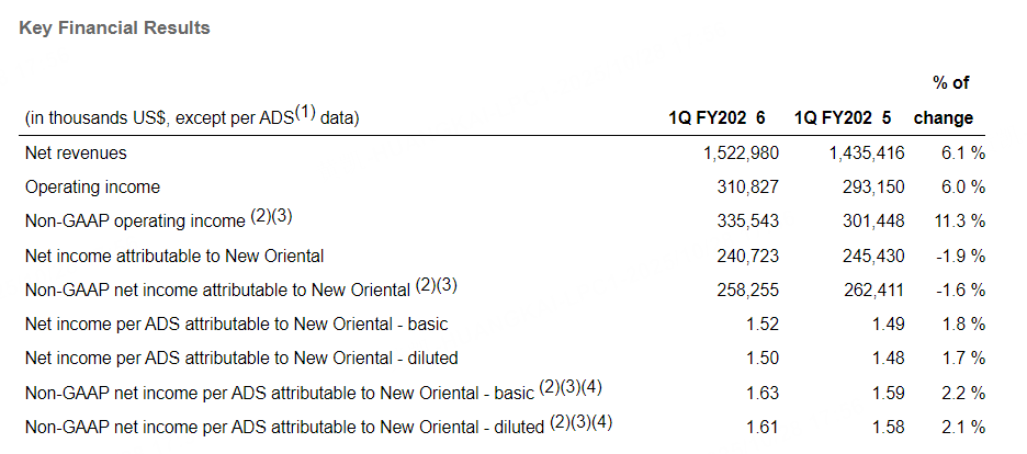 10月28日,新东方公布了截至2025年8月31日的2026年第一财季业绩,具体情况如下: