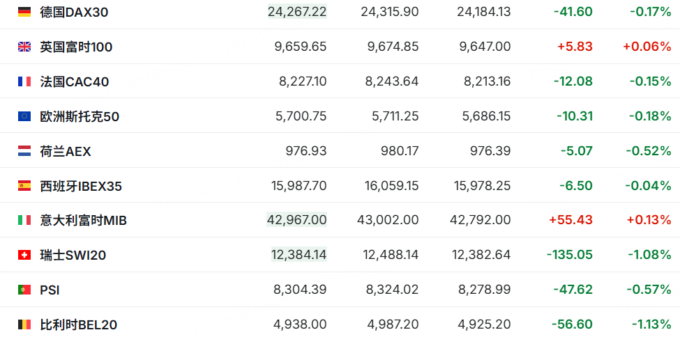 欧洲主要股指跌多涨少,德国DAX30跌0.17%,法国CAC40跌0.15%。