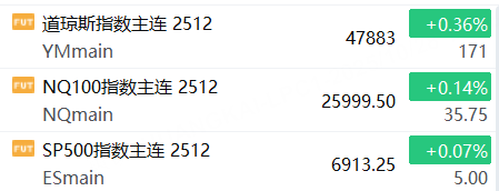 10月28日,美股三大股指期货上涨,截止发稿,道指期货涨0.36%,纳指期货涨0.14%,标普500指数期货涨0.07%。
