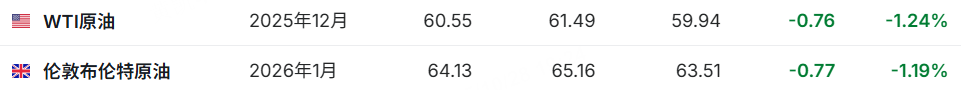 原油期货下跌,截止发稿,WTI原油跌1.24%,报60.55美元/桶;布伦特原油跌1.19%,报64.13美元/桶。