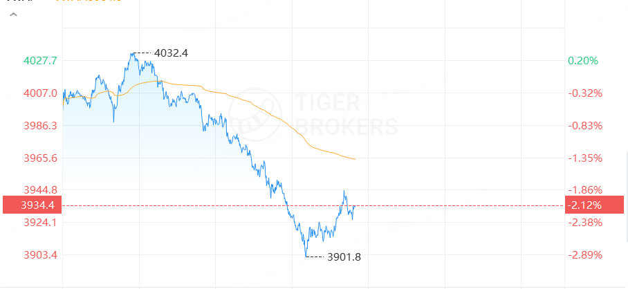 黄金期货下跌,截止发稿,跌2.12%,报3,934.4美元/盎司。