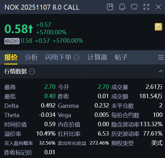 诺基亚一张下周五到期的CALL,行权价8美元,价格飙升57倍!