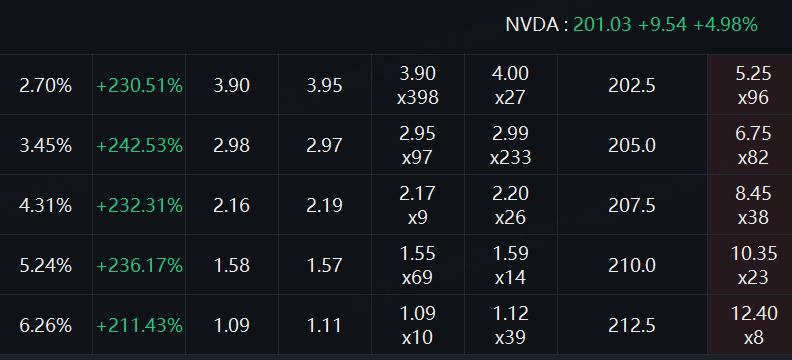 英伟达认购期权的价格涨幅也非常惊人,多张CALL拉升超200%。