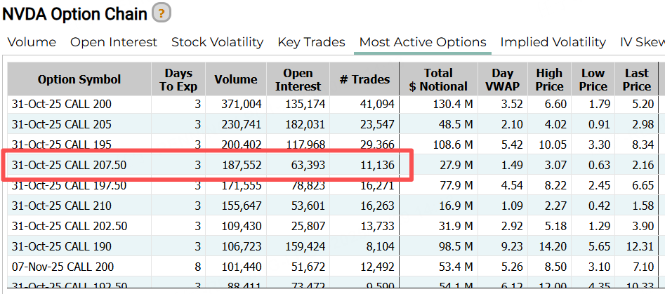 英伟达昨日的前十大期权成交全部是认购合约。其中,一份10月31日到期的CALL,行权价207.5美元,展现乐观情绪。