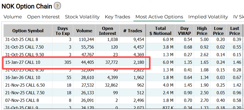 诺基亚昨日前十大成交期权均为认购合约。其中,一份2027年初到期的CALL,行权价10美元,较现价有约30%的涨幅空间。参照近期的行情,这个行权目标是积极还是保守呢?