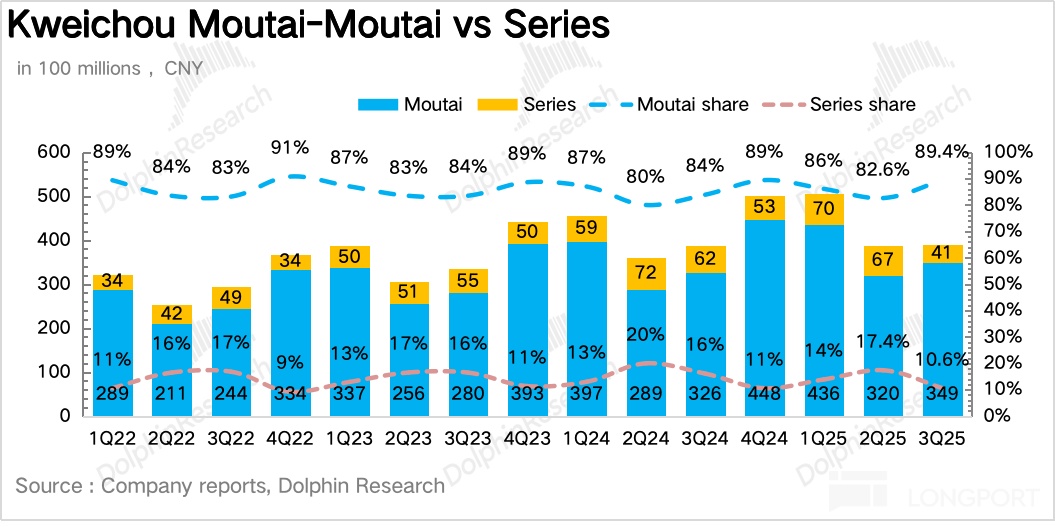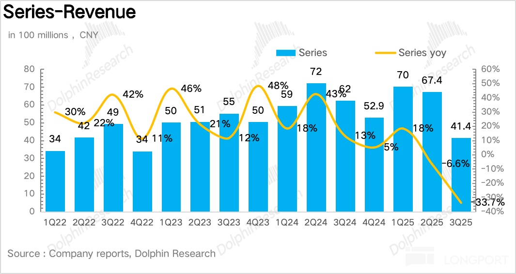 3、系列酒下滑严重。3Q25 系列酒实现营收 41 亿元,同比下降 33.7%,在价格全面倒挂 + 渠道高库存 + 需求萎靡的情况下,海豚君推测为了减轻渠道负担,公司三季度基本放弃了通过向经销商压货实现增长。