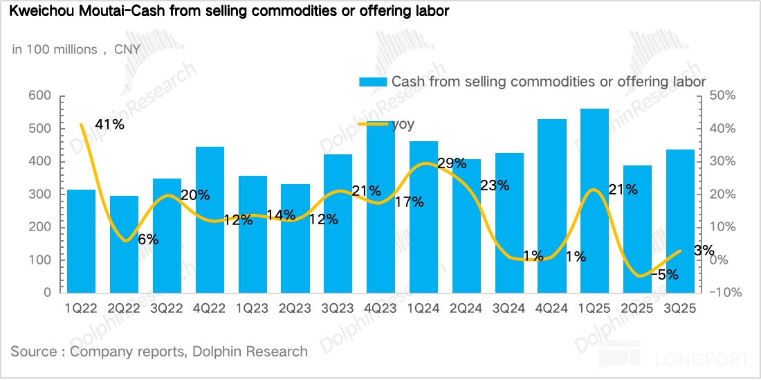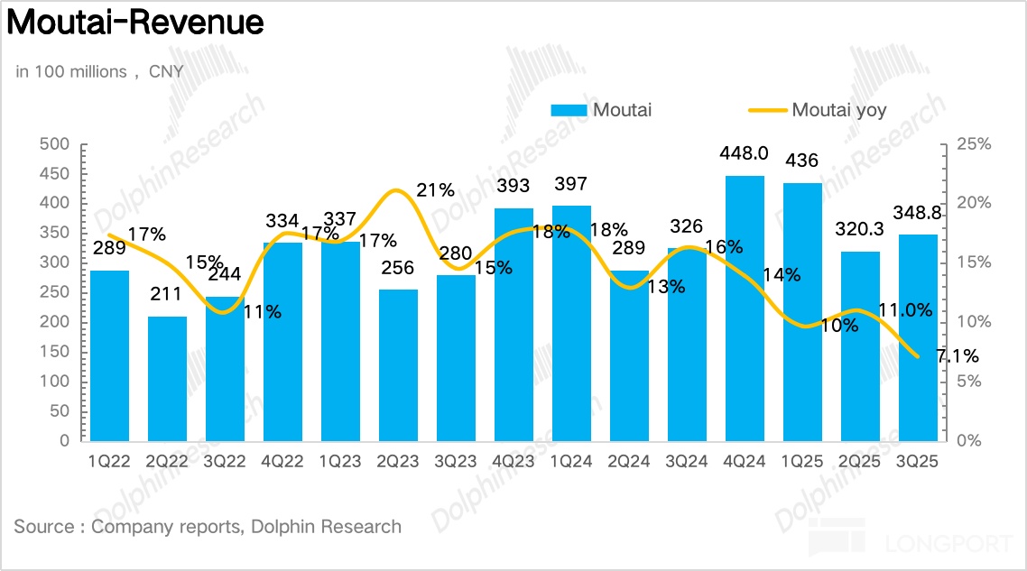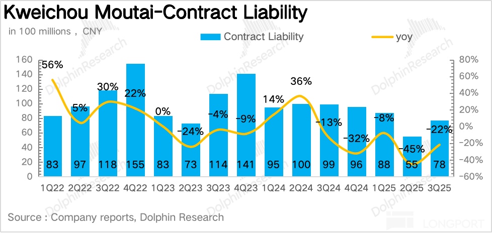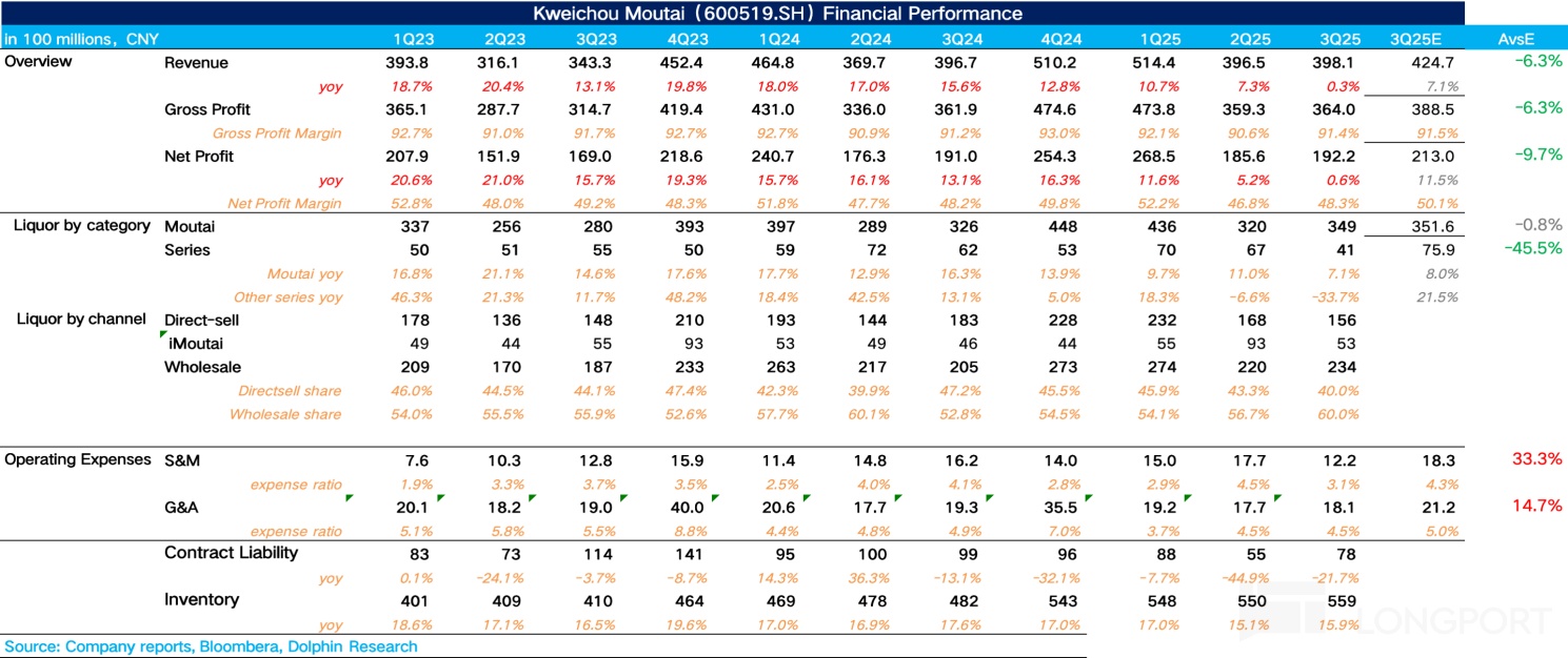 3Q25 茅台共实现营收 398.1 亿元,同比增长 0.3%,低于市场预期(市场预期为 425 亿元)。核心在于市场预期主要基于上个季度的增速进行线性外推,而低估了酒企释放渠道压力的决心。其实三季度业绩持续降速从二季度合同负债大幅下滑(同比下降 45%)就已经可以推测,因此海豚君并没有过于意外。毕竟只有给渠道减负,在下一轮需求起来的时候,才能更好 “深蹲起跳”。