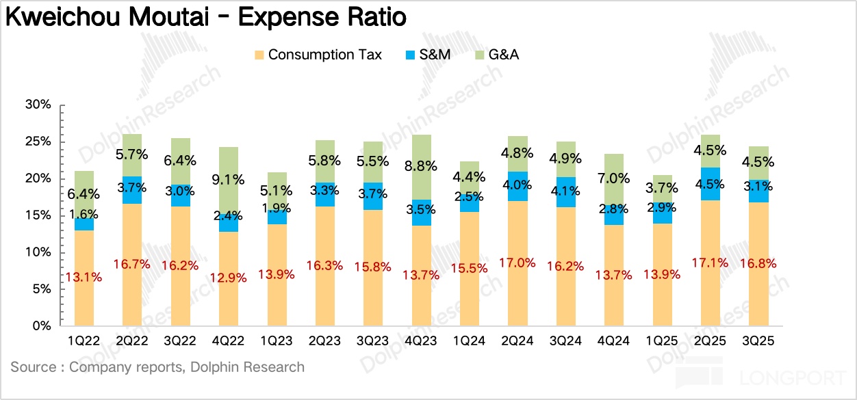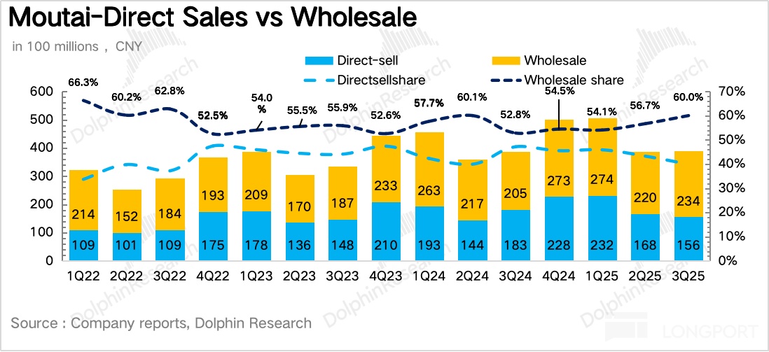 4、直营占比大幅下降。3Q25 茅台直营渠道实现营收 156 亿元,同比下滑 14.8%,直营渠道占比回落至 40%,海豚君推测一方面由于直营渠道更能反应终端实际疲弱的需求,另一方面,非标酒批价的持续下滑也影响了消费者的申购意愿(非标酒多数通过直营渠道投放)。