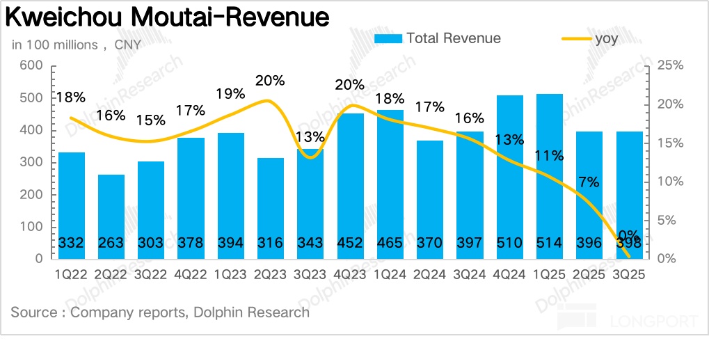 1、整体业绩实现正增长:3Q25 茅台共实现营收 398.1 亿元,同比增长 0.3%,低于市场预期(市场预期为 425 亿元)。核心在于市场预期主要基于上个季度的增速进行线性外推,而低估了酒企释放渠道压力的决心。