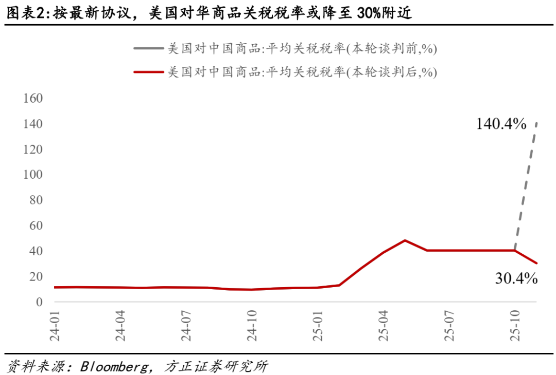10月30日中美元首会晤后,对外公布吉隆坡经贸磋商成果,关税战再度缓和:(1)关税税率下调,且美国24%对等关税暂停一年:美方将取消针对中国商品加征的10%所谓“芬太尼关税”,对中国商品加征的24%对等关税将继续暂停一年。中方将相应调整针对美方上述关税的反制措施。粗略计算,美国对中国产品平均关税税率从此前7月的40%降至30%附近;(2)50%穿透性的出口管制政策暂停一年:美方将暂停实施其9月29日公布的出口管制50%穿透性规则一年。中方将暂停实施10月9日公布的相关出口管制等措施一年;(3)美国对华海事、物流和造船业301调查措施暂停一年:美方暂停实施相关措施后,中方也将相应暂停实施针对美方的反制措施一年。此外,双方还就芬太尼禁毒合作、扩大农产品贸易、相关企业个案处理等问题达成共识。