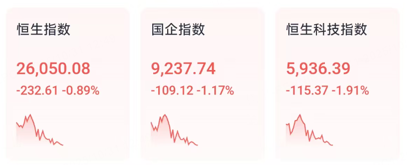 10月31日周五,港股三大指数上午均呈现低开低走行情,恒生科技指数跌幅最大,午间收跌1.91%,恒生指数跌0.89%险守26000点大关,国企指数跌1.17%。
