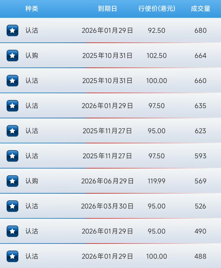 比亚迪股份上午的认沽合约成交活跃,在前十中占据八席。不过,仍有一份成交量较高的CALL,行权价达119.99港元,到期日为明年6月29日。