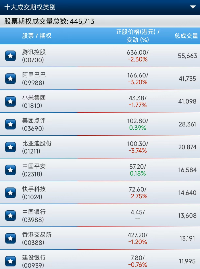港股期权半日成交445713张。其中,腾讯控股成交量居首,期权成交55663张。阿里巴巴、小米集团、美团、比亚迪股份等成交量紧随其后。
