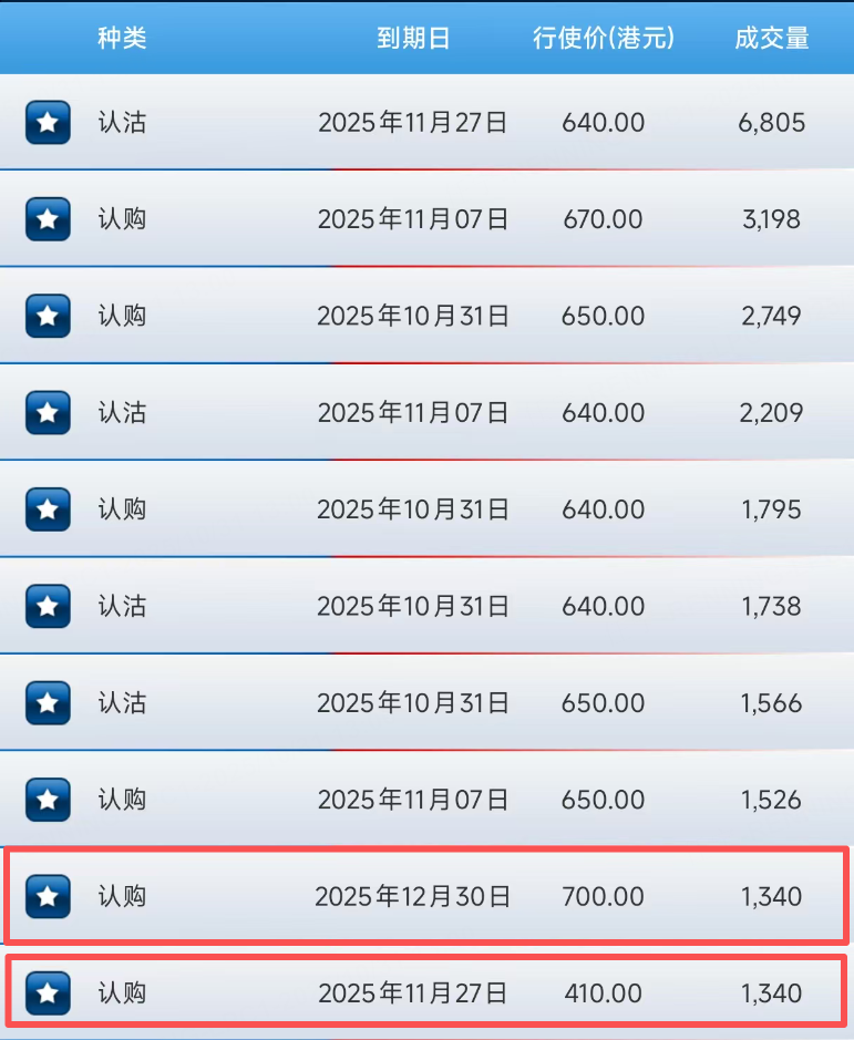 上午成交前十的期权中,有两张认购合约比较引人关注。一份年底到期,行权价高达700港元,超过腾讯股价的历史纪录;另一份11月27日到期,行权价低至410港元。