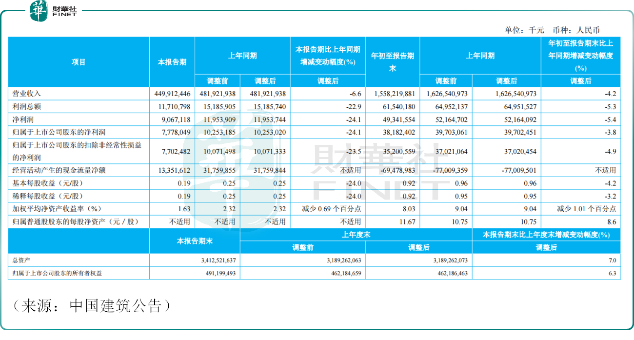 作为基建领域的龙头,中国建筑2025年前三季度实现营业收入1.56万亿元,同比下滑4.2%;归母净利润381.82亿元,同比下滑3.8%。