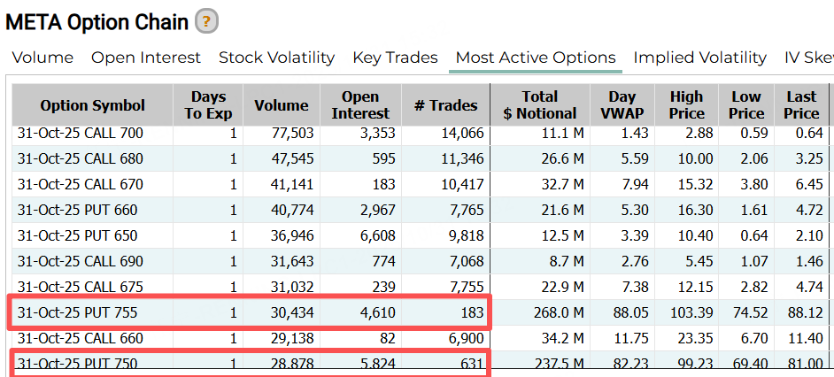 周四Meta期权合约成交量达233万份,较前一交易日增长374%。其中两张PUT的行权价分别达到750及755美元,根据当前行情,应该已有投资者获得丰厚收益。