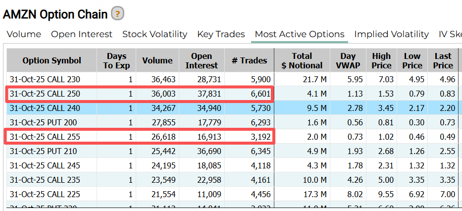 亚马逊排名前十的合约中,出现了两张行权价250美元及以上的CALL,超过历史纪录,表现了积极的态度。