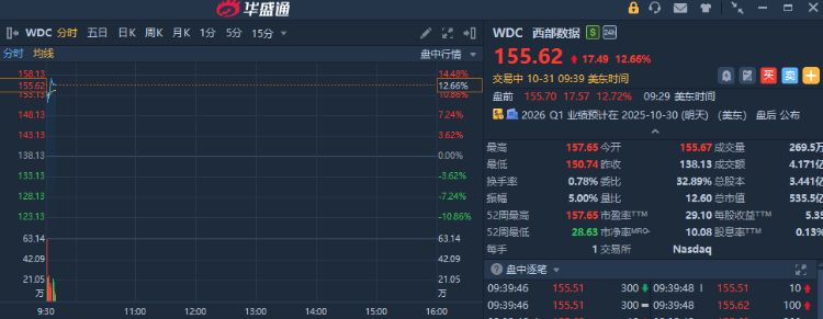 美股存储概念股走强,西部数据涨超12%,Sandisk Corporation涨超5%,希捷科技涨超3%。