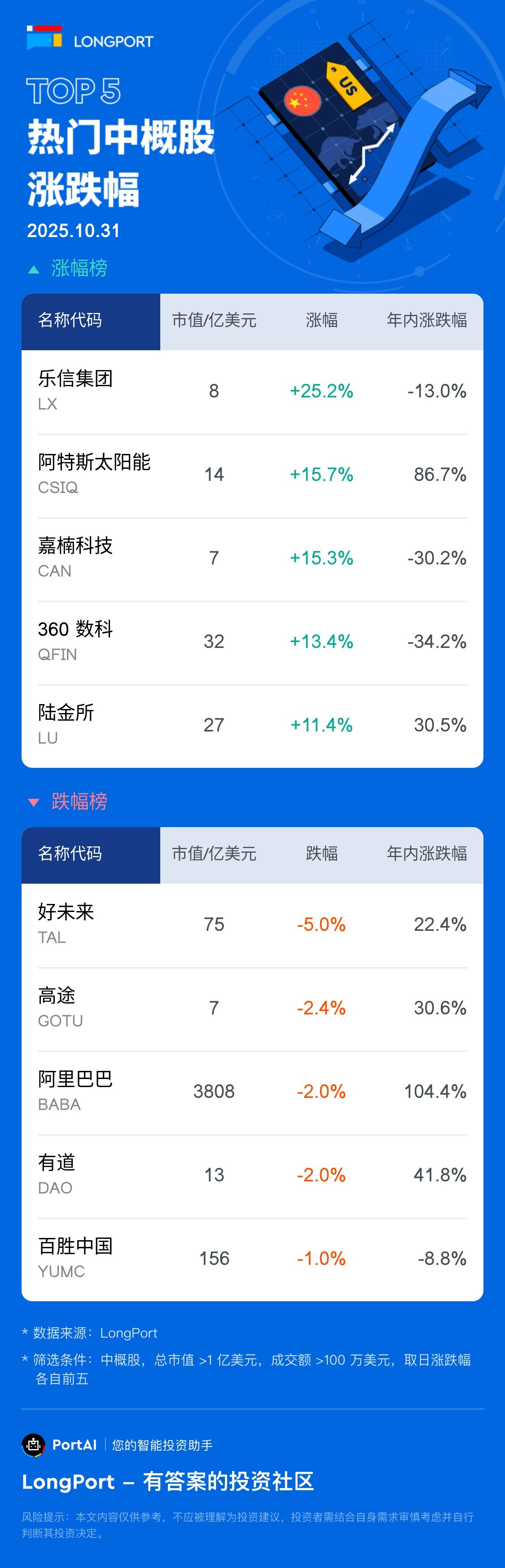 乐信集团 (LX) 涨 25.19%,成交额 7936.8 万美元,年内累计跌 13%。
