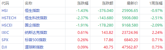港股方面,本周恒生指数跌0.97%,报25906.65点;恒生科技指数跌2.51%,报5908.08点;国企指数跌2.09%,报9168.58点;
