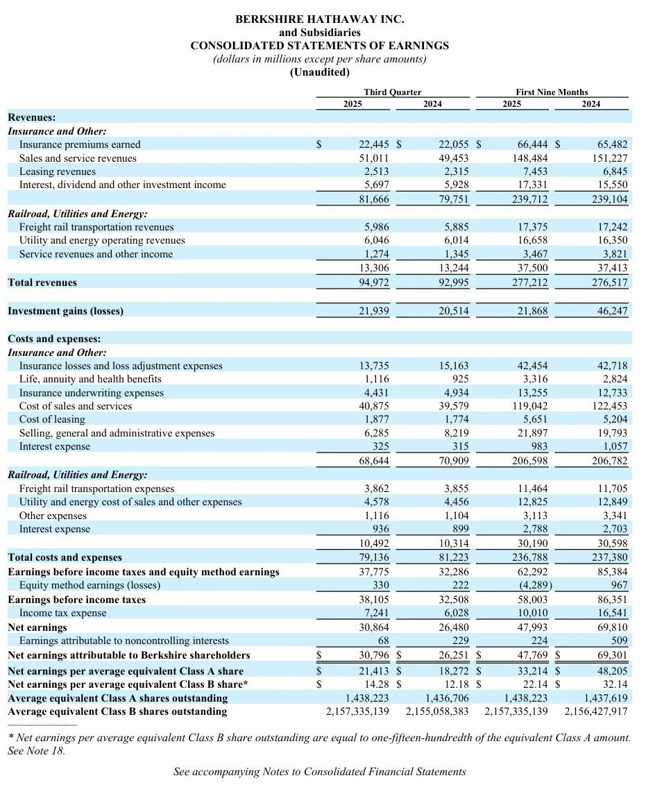 截至2025年9月30日和2024年12月31日,公司前五大持仓的公允价值分别占其权益证券总公允价值的66%和71%。这五大持仓公司均为:美国运通公司(American Express Company)、苹果公司(Apple Inc.)、美国银行(Bank of America Corporation)、可口可乐公司(The Coca-Cola Company)和雪佛龙公司(Chevron Corporation)。截至2025年9月30日,公司持有美国运通公司1.516亿股普通股,占其流通普通股的22.0%。此外,三季度公司还持有西方石油公司的普通股。