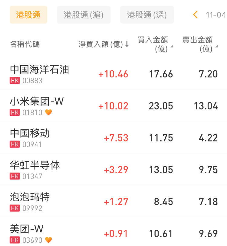 中国海洋石油、小米集团-W、中国移动分别获净买入10.46亿港元、10.02亿港元、7.53亿港元;