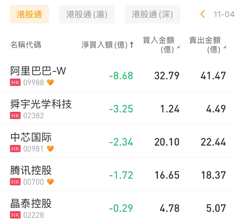 阿里巴巴-W、舜宇光学科技、中芯国际分别遭净卖出8.68亿港元、3.25亿港元、2.34亿港元。