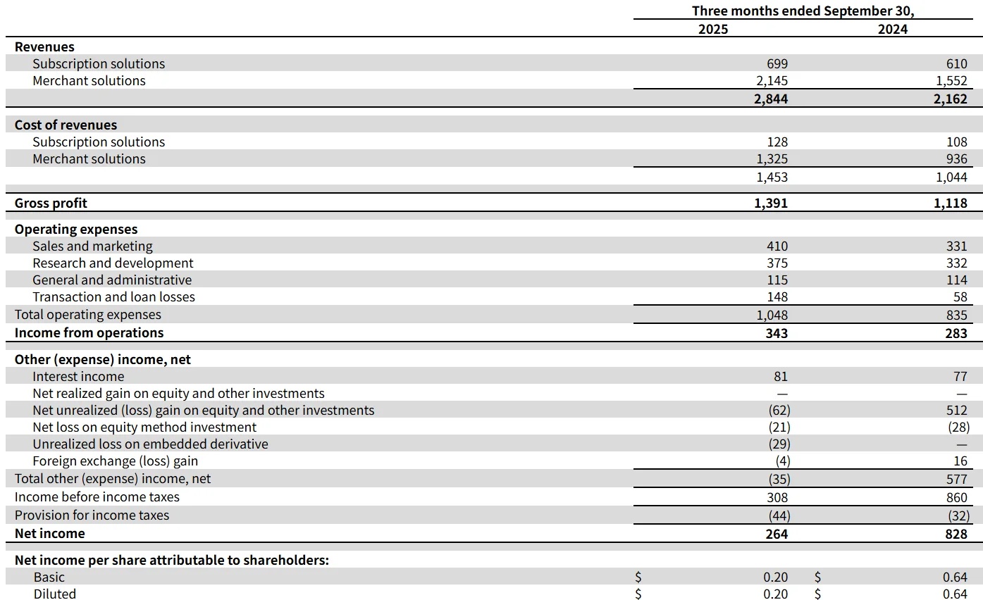 Shopify Inc 三季度营收28.44亿美元,市场预期27.6亿美元,去年同期为21.62亿美元。