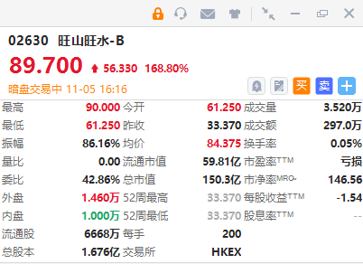 华盛资讯11月5日讯,港股旺山旺水-B正在暗盘交易中,截至发稿涨168.8%,报89.7港元/股,中签一手账面浮盈11266港元,最新总市值超59亿港元。该股预计将于11月6日正式挂牌上市,配售结果将于今日晚间披露。