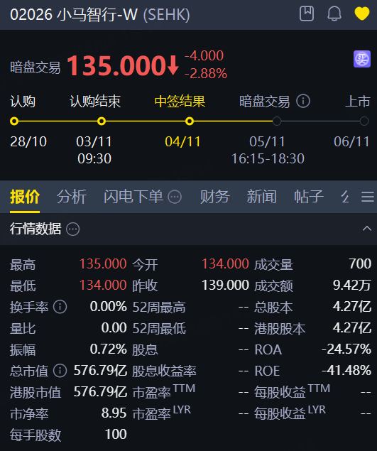 11月5日,小马智行-W暗盘跌近3%,总市值超570亿港元;公司每股定价139港元,每手100股,将于11月6日(周四)正式挂牌交易。