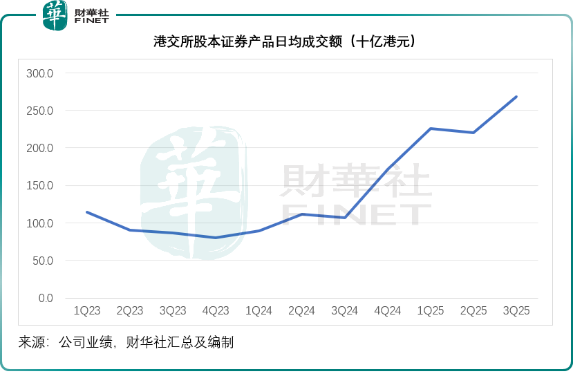 新股畅旺,市场的交投也异常活跃。2025年第3季,港交所股本证券产品日均成交额同比大增149.91%,按季增长21.61%,达到2,679亿港元,见下图。