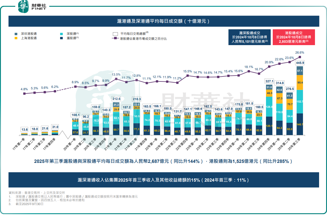 其中沪深港股通交易活跃,沪股通和深股通的2025年第3季日均成交额的按年增幅和按季增幅分别达到143.61%和77.01%,南下资金强势,港股通日均成交额更按年大增285.10%,按季增加36.16%,达到1,525亿港元,占到联交所日均交易总额(包括买卖盘)的比例,由上年同期的16.7%和上个季度的23.6%,进一步上升至26.6%,见下图,反映南下资金在港股市场中的重要性在提升。